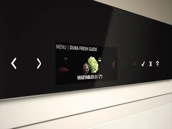 Управление и функции: Адаптивный контроль температуры: экономия энергии и сохранение свежести продуктов. Полноцветный 2,86" TFT-дисплей за дверью, с сенсорным управлением. Цифровая индикация температуры для холодильной камеры. Сигнал открытой двери: оптический и акустический. Количество температурных зон: 2. Число регулируемых контуров охлаждения: 1. "Ночной" режим. Режим "Эко". Режим "Отпуск" (Holiday mode). Режим "Вечеринка" (Party Mode). Режим "Шаббат". Режим "Очистка" (Cleaning Mode). Блокировка экрана.