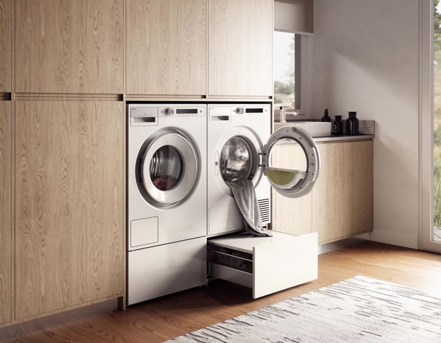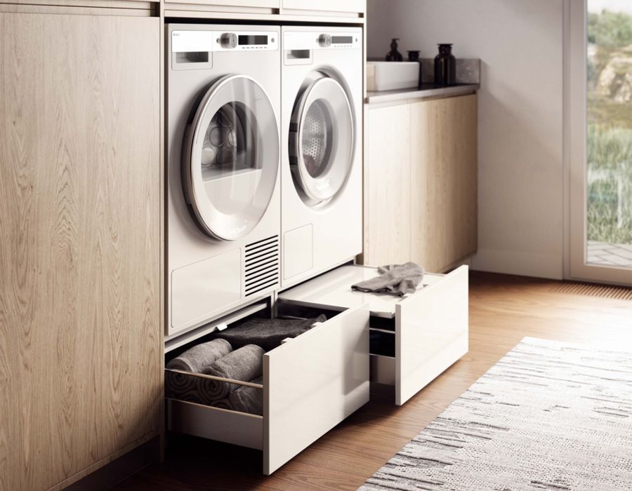 Просторный напольный ящик для хранения моющих средств, вешалок, инструкций и других аксессуаров одновременно служит подставкой, благодаря которой стиральная или сушильная машина приподнимется на 30 см от пола для удобства загрузки и разгрузки.