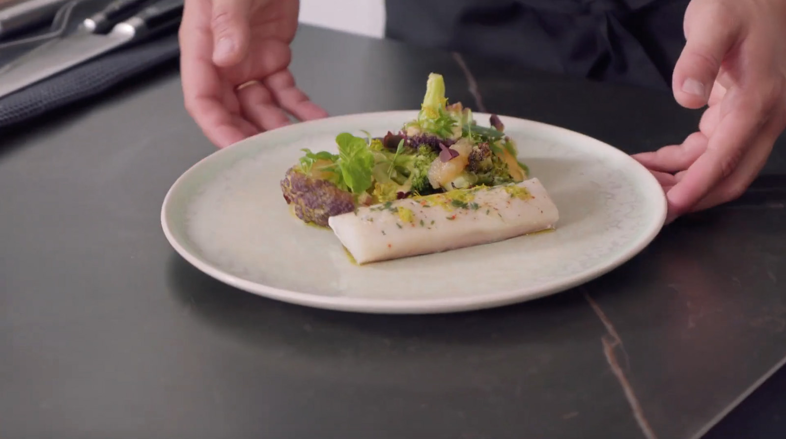 Подача: Треску подаем вместе овощами c соусом Беарнез и щучьей икрой